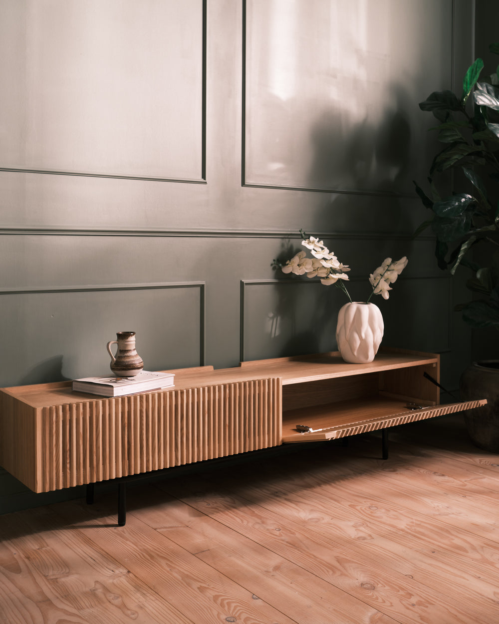 Møbler skal passe ind i en moderne og travl hverdag. Derfor har vi klargjort til at du kan få ledninger trukket de rigtige steder hen. Find Udskæringer til kabelføring i TV-bordet og skænkene.