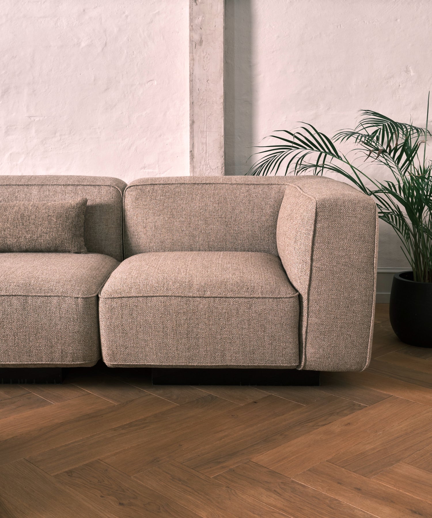 Sofaens design er bygget omkring rene ubrudte syninger og store flader af tekstil; løftet på en sokkel der giver et let og simpelt udtryk.