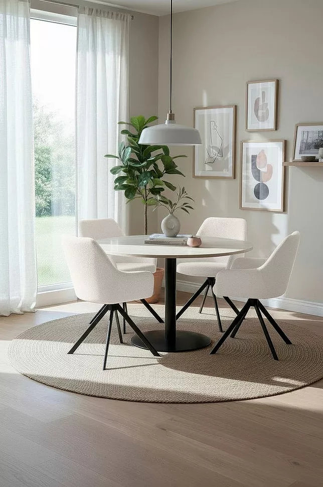 De sorte metalben har drejefunktion så man nemt kan komme til og fra bordet.